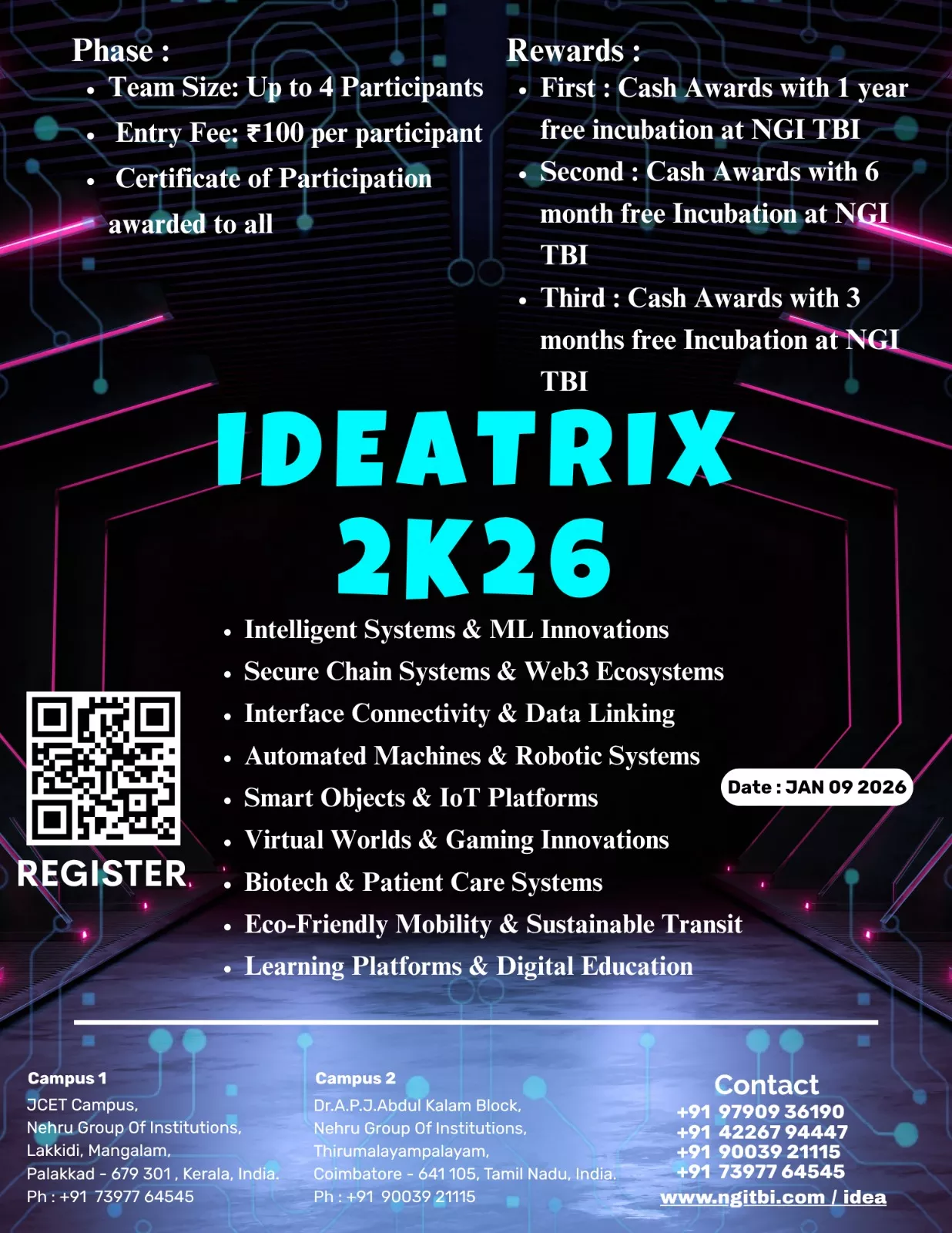 🌟 IDEATRIX 2K26 – Innovation Redefined! 🚀 Presented by Nehru Group of Institutions Technology Business Incubator (NGI TBI)Catalysed & Supported…