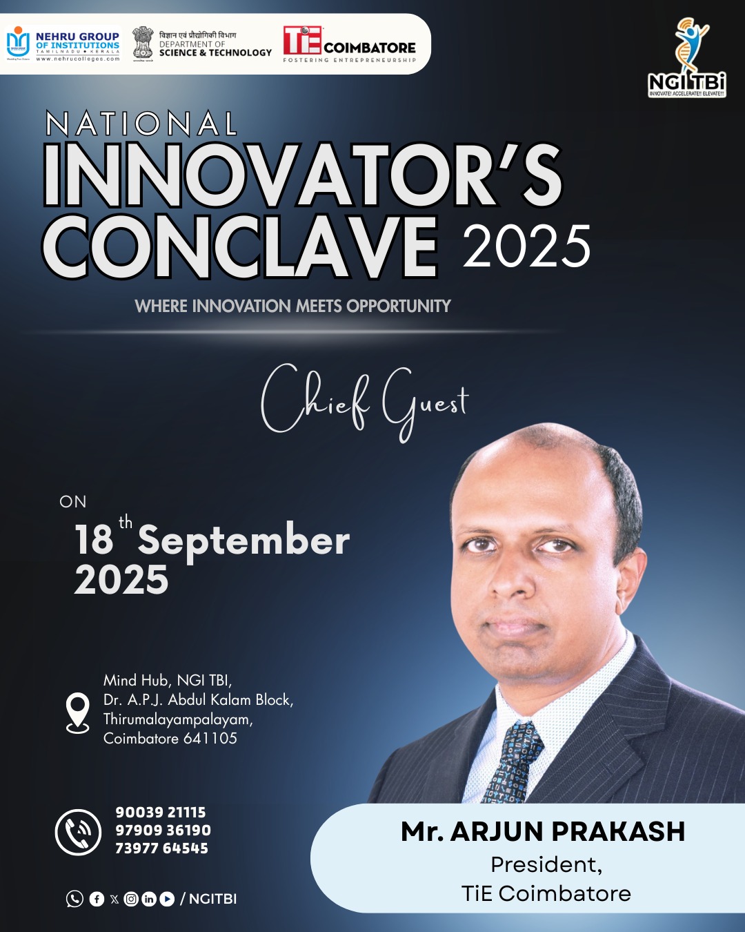 We are delighted to announce that Mr. Arjun Prakash, President – TiE Coimbatore , will be joining us as the Chief Guest to inaugurate the National Innovator’s Conclave 2025. 🚀✨